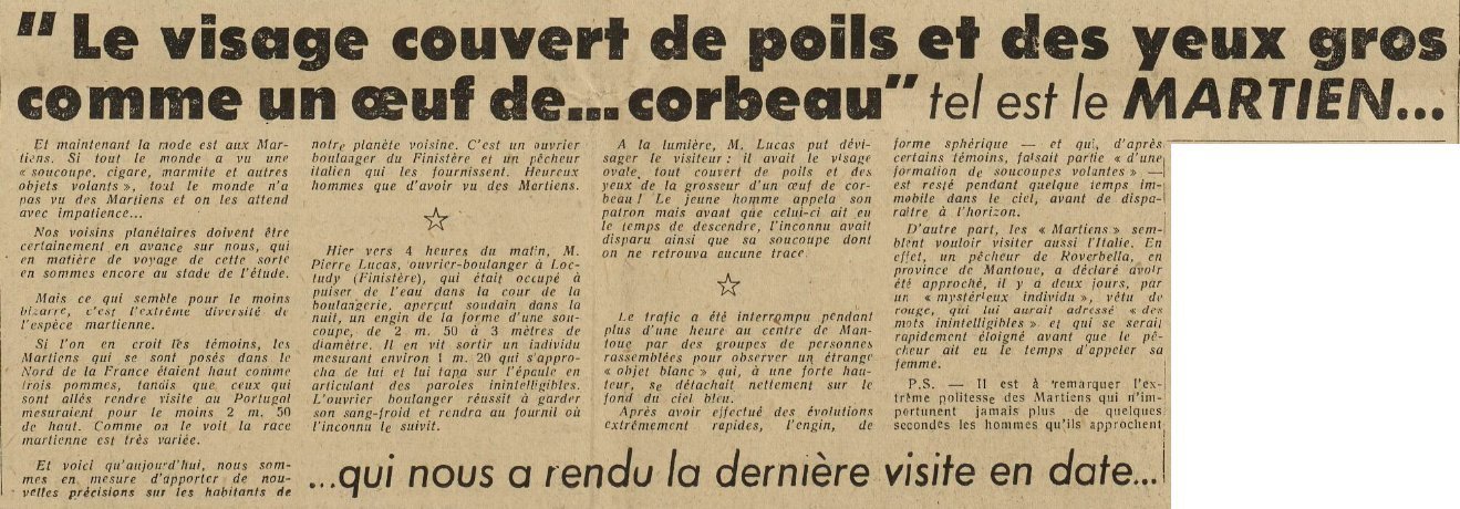 Hier vers 4 heures du matin, M. Pierre Lucas, ouvrier boulanger à Loctudy (Finistère), qui était occupé à puiser de l'eau dans la cour de la boulangerie, aperçut soudain dans la nuit, un engin de la forme d'une soucoupe, de 2 m. 50 à 3 mètres de diamètre. Il en vit sortir un individu mesurant environ 1 m. 20 qui s'approcha de lui et lui tapa sur l'épaule en articulant des paroles inintelligibles. L'ouvrier boulanger réussit à garder son sang-froid et rentra au fournil où l'inconnu le suivit.