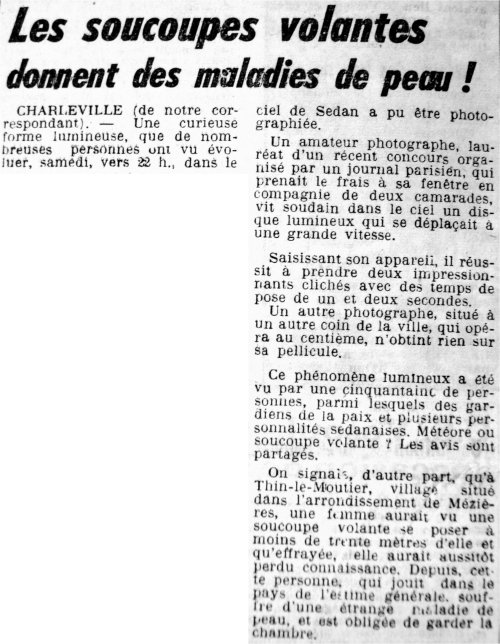 The regional newspaper L'Est Républicain for October 21, 1954, reported among other things, on page 6, that one reported that in Thin-le-Moutier, a village in the district of Mézières, a woman saw a flying saucer land at less than thirty meters from her and that, frightened, she lost consciousness immediately.