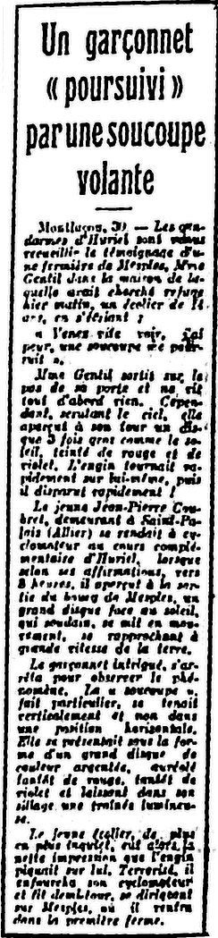 "Un profond émoi régnait hier matin au cours complémentaire d'Huriel. Les élèves d'habitude bruyants, avaient, pour la plupart, formé un cercle attentif autour d'un de leurs camarades. Jean-Pierre Coubret, âgé de 14 ans, demeurant à Saint-Palais, leur racontait son ahurissante rencontre avec 'une soucoupe volante': un disque mystérieux, auréolé de rouge, l'a poursuivi quelques secondes, alors qu'il se rendait à l'école. Deux habitants de Mesples ont également observé le phénomène, mais n'osent formuler aucune hypothèse."