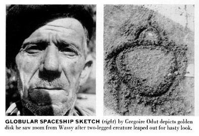 DESSIN D'UN ENGIN SPATIAL EN FORME DE GLOBE (à droite) par Grégoire Odut qui dépeint un disque doré qu'il a vu filer de Wassy après qu'une créature bipède en ait émergé pour un regard rapide.