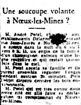 The regional newspaper La Voix du Nord, in the local edition of Béthune for October 9, 1954, reported that Mr. André Potel, driver, living on rue Jean-Jaurès in Noeux-les-Mines, had seen in the night from October 6 to 7, 1954, around 00:11 a.m., a craft in the shape of a mushroom, surrounded by a reddish line, which remained motionless in the sky.