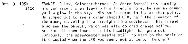 Le site web indique que le 9 octobre 1954 à 21:20 à Cuisy, France, "Interférence d'allumage: le moteur et les lumières de voiture sont morts quand un cigare jaune-orange est passé au-dessus." "On a observé un objet. Des effets électromagnétiques ont été notés. Un objet en forme de cigare orange, plus grand qu'une étoile, a été observé par deux témoins masculins sur une route (Bartoli; Fabre)."