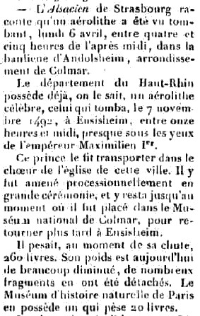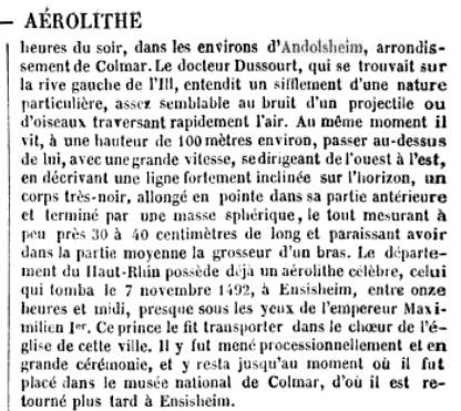 The newspaper L'Alsacien reported the fall of a meteorite in the suburbs of Andolsheim, in the Colmar district. By chance a competent observer, Dr. Dussourt, chief physician of the military hospital in Colmar, was on the spot, he could see the phenomenon and determine a fairly approximate area of the country where the meteor fell.