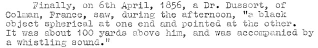 Finally, on 6th April, 1856, a Dr. Dussort, of Colman [sic], France, saw, during the afternoon, "a black object spherical at one end and pointed at the other. It was about 100 yards above him, and was accompanied by a whistling sound."