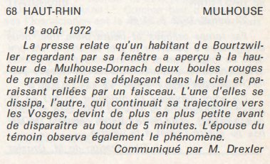 On Friday August 18, 1972, a couple from Bourtzwiller (68) reportedly saw through the window of their home, at the height of Mulhouse-Dornach, two large red balls connected by a beam moving in the sky. One of them reportedly dissipated while the other continued its trajectory towards the Vosges.