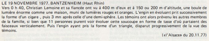 Source: J.Journot and M. Pernot investigation (LDLN nr 180 p. 27/29), "L'Alsace" for 11/20/77 (LDLN nr 172), "UFOLOGIA" nr 13 p. 7.