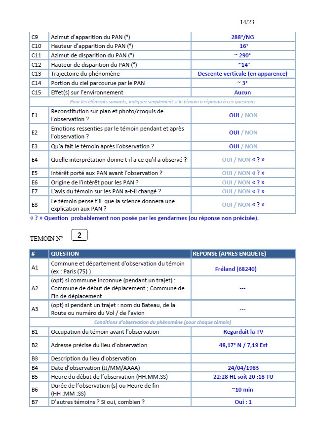 CE JOUR, 26 avril 1986 à 14 heures, nous apprenons que le Lieutenant-Colonel [], a aperçu le dimanche 24 avril 1983 à 22 heures20 dans le ciel de FRELAND au-dessus de la montagne, un phénomène aérien non identifié. AprèS vérification de la véracité de notre information, nous ouvront une enquête.
