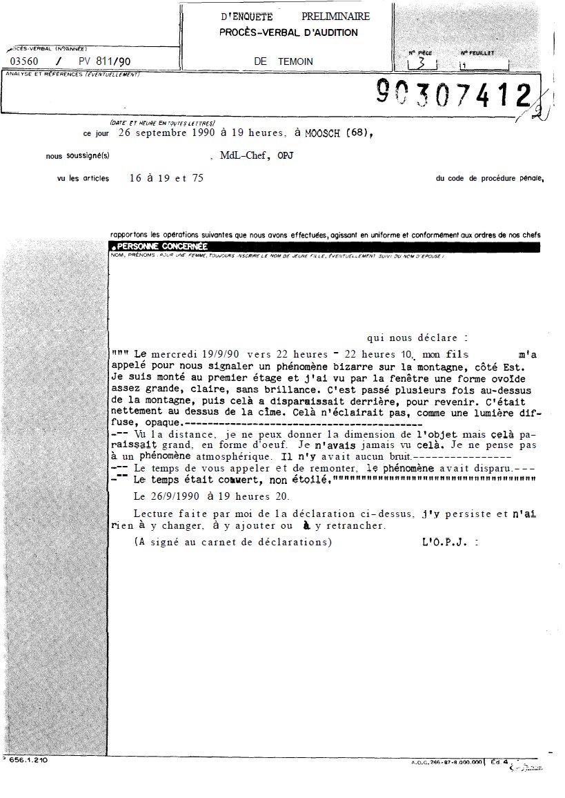 The gendarmes' report indicates that on September 19, 1990 at 10:19 p.m., while patrolling in Moosch, they were informed by the gendarme on duty at their unit that their intervention had been requested in Moosch by a family who had just observed a UFO from their home.