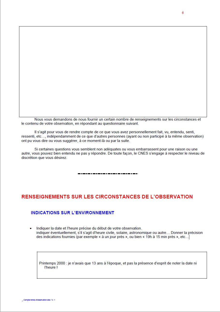 This questionnaire begins with a free narration of observation and continues with a list of more specific questions. It is important to start by freely writing all the memories preserved during the observation and this, before reading the questionnaire. Then, it will be necessary to fill it as completely as possible (you can however skip the questions you could not or would not want to answer). It may be that the questionnaire remained you memories or inspired by the comments. We then invite you to fill in the final pages provided for this purpose.
