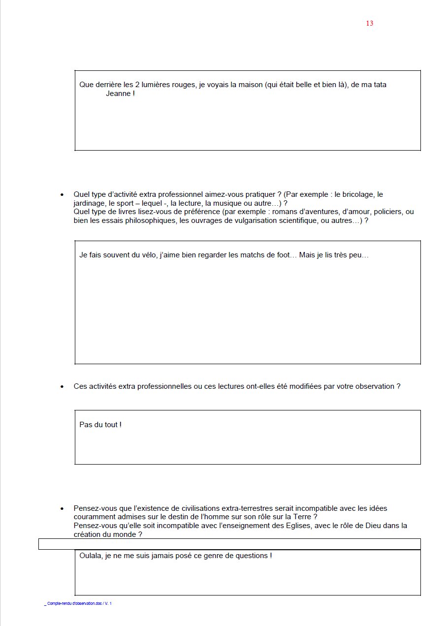 You will send the questionnaire back to us, after having filled it, it will then be studied with the other documents dealing with the same phenomenon. When the work is completed, we will let you know the conclusions that we may have drawn.