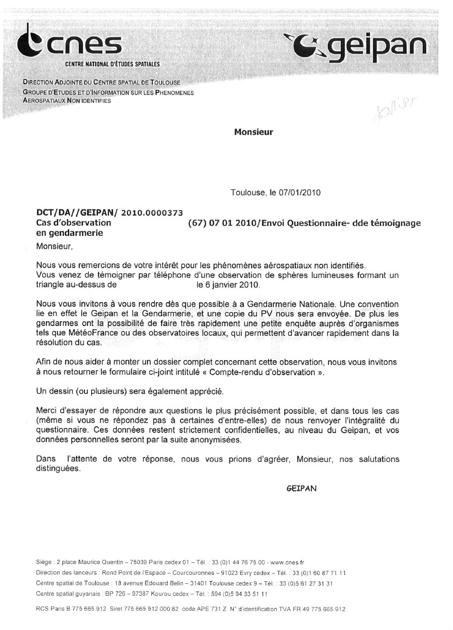 The GEIPAN invited this witness by mail to fill in their standard questionnaire for observation reporting, and to go to the Gendarmerie to make a statement, but the witness did not do so, even after a follow-up mail.