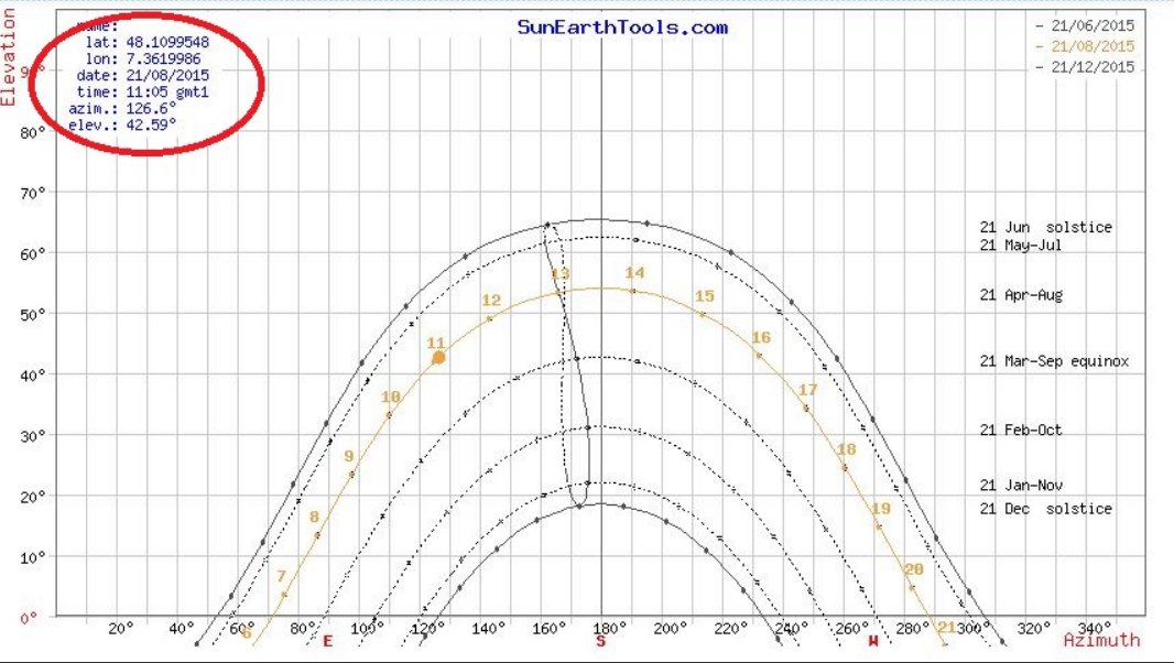 Les éphémérides depuis le lieu d'observation donnent la position du soleil à 11h05 au 127° (au Sud-Est), avec 43° d'élévation, voir le fichier: "Ephémérides Soleil.jpg". La trajectoire du phénomène du Nord au Nord-Ouest, estimée par le témoin, est au 220°, avec une élévation décroissante de 40° à 20°, diamétralement opposée au soleil. La carte dans le fichier "Hyp Carte reflet soleil.jpg" positionne ces éléments.