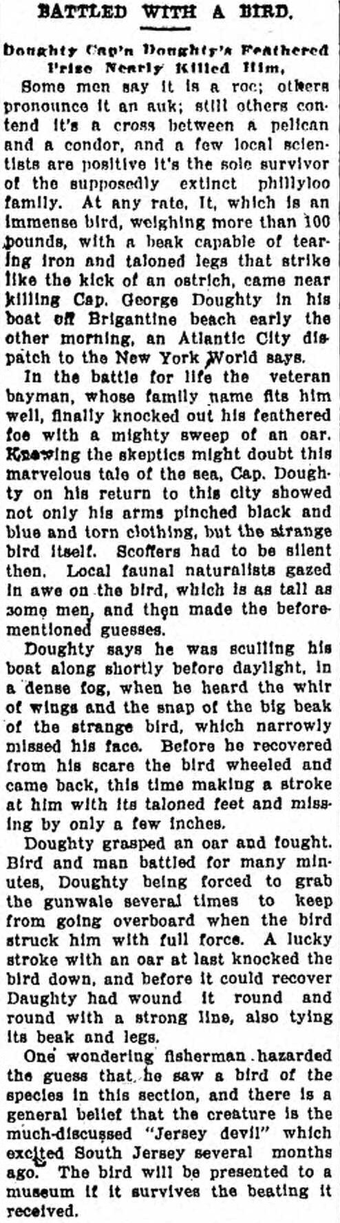 BATTLED WITH A BIRDDoughty Cap'n Doughty's Feathered Prize Nearly Killed Him Some men say it's a roc, others pronounce it an auk; still others contend it's a cross between a pelican and a condor, and a few local scientists are positive it's the sole survivor of the supposedly extremely extinct phylliloo family. At any rate, It, which is an immense bird, weighing more than one hundred pounds, with a beak capable of tearing iron and taloned legs that strike like the kick of an ostrich, came near killing Capt. George Doughty in his fishing boat off Brigantine Beach. In the battle for life the veteran bayman, whose family name fits him well, finally knocked out his feathered foe with a mighty sweep of an oar. Knowing the skeptics might doubt this marvellous tale of the sea, Cap'n Doughty on his return to this city, showed not only arms pinched black and blue and torn clothing, but the strange bird itself. Scoffers had to be silent then. Local faunal naturalists gazed in awe on the bird, which is as tall as some men and then made the before-mentioned guesses. Doughty says he was sculling his boat along shortly before daylight, in a dense fog, when he heard the whirr of wings and the snap of the big black beak of the strange bird, which narrowly missed his face. Before he recovered from the scare the bird wheeled and came back, this time making a stroke at him with its taloned feet and missing him by only a few inches. Doughty grasped an oar and fought. Bird and man battled for many minutes, Doughty being forced to grab the gunwalre several times to keep from going overboard when the bird struck him with full force. A lucky stroke with an oar at last knocked the bird down, and before it could recover Doughty had wound it round and round with a strong line, also tying its beak and legs. One wondering fisherman hazarded the guess that he saw a bird of the species in this section, and there is a general belief that the strange creaure is the much-discussed "Jersey Devil" which excited South Jersey several months ago. The bird will be presented to a museum if it survived the beating he received. |