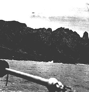 Agrandissement de la première photographie de l'OVNI prise par Barauna depuis un navire Brésilien au large de l'île de Trindade. L'insert montre l'agrandissement de l'OVNI lui-même. |