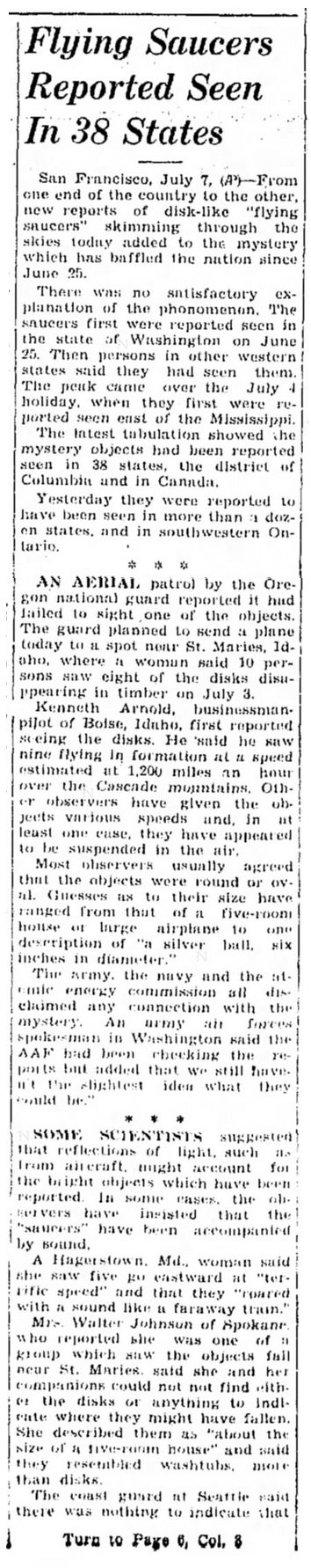 San Francisco, July 7, (AP) -- From one end of the country to the other, new reports of disk-like "flying saucers" skimming through the sky today added to the mystery which has baffled the nation since June 25.