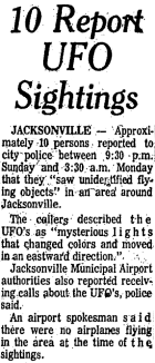 JACKSONVILLE. -- Approximativement 10 personnes ont rapporté à la police de la ville entre 21:30 dimanche et 03:30 heure du matin lundi qu'elles ont "vu un objet volant non identifié" dans un secteur autour de Jacksonville.