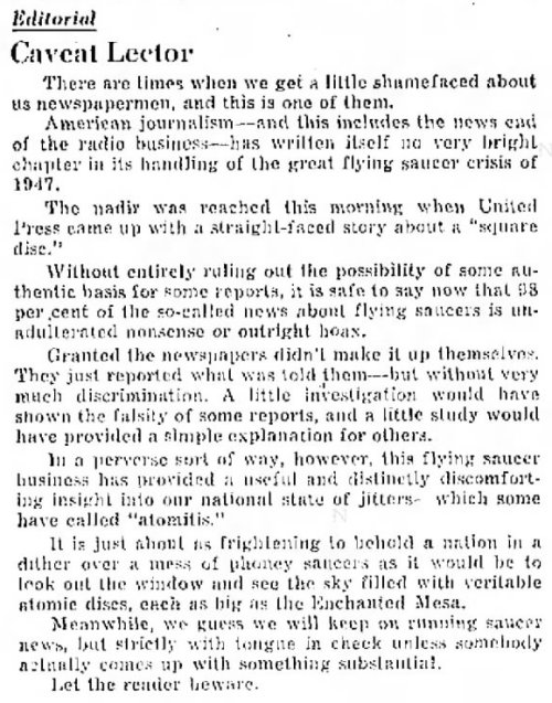 American journalism - and this includes the news end of the radio business - has written itself no very bright chapter in its handling of the great flying saucer crisis of 1947.